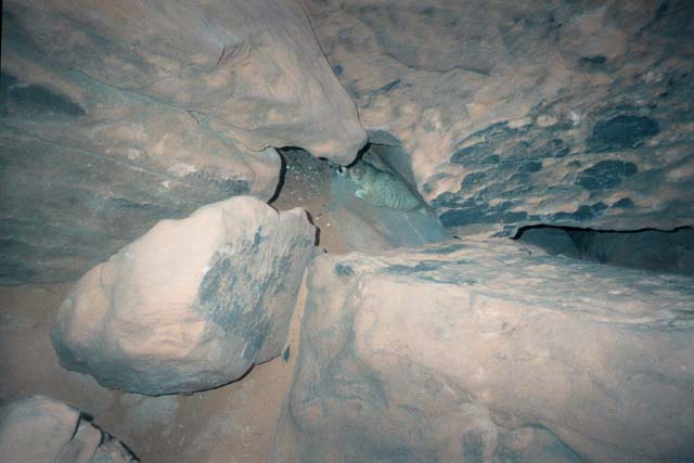 Tad: Later in the day we were standing on this bolder pile, packing up when this animal, a Ringtail came out from under the rocks, scavenging for scraps of food that people dropped.