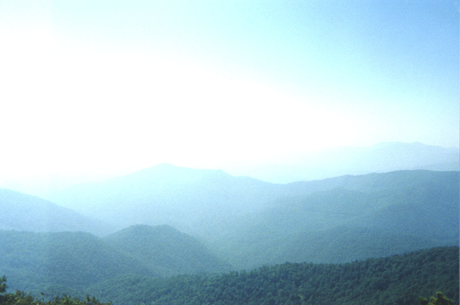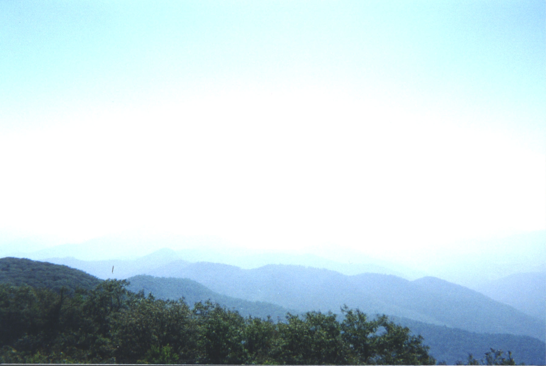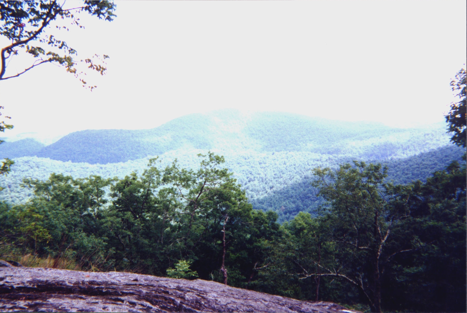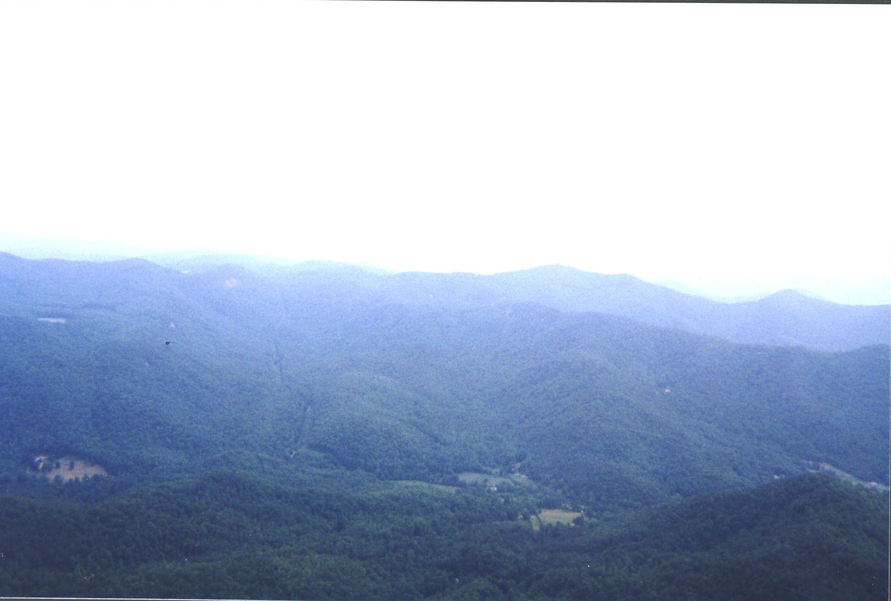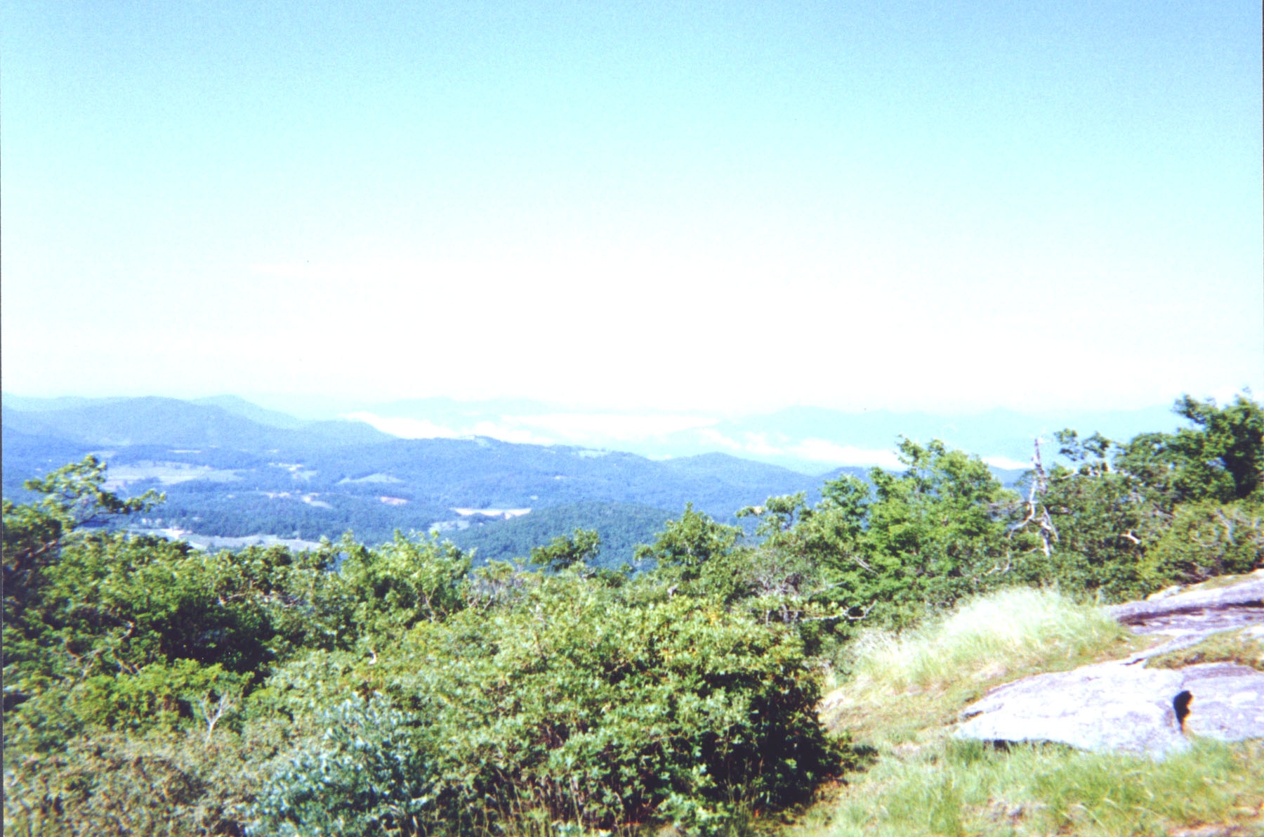 Woke up late, had oatmeal for breakfast, and didn't get on the trail until about 1030. We proceeded up Scaly Mountain, to where the spur trail went to the peak. There we doffed our packs (see, we can learn) and headed up to the summit at 4,804 feet. All that work getting there was well worth it. Looking out over the valley, we could see endless mountains fading to the horizon in the hazy water vapor filled air. Words can't begin to describe the beauty. The view covered an arc from the southwest through the southeast. Back along the Tennessee Valley Divide, we could see Rabun Bald, where we started. We took the maps out, and as the crow flies, it looked to be about five miles away, which put the horizon at about ten miles.