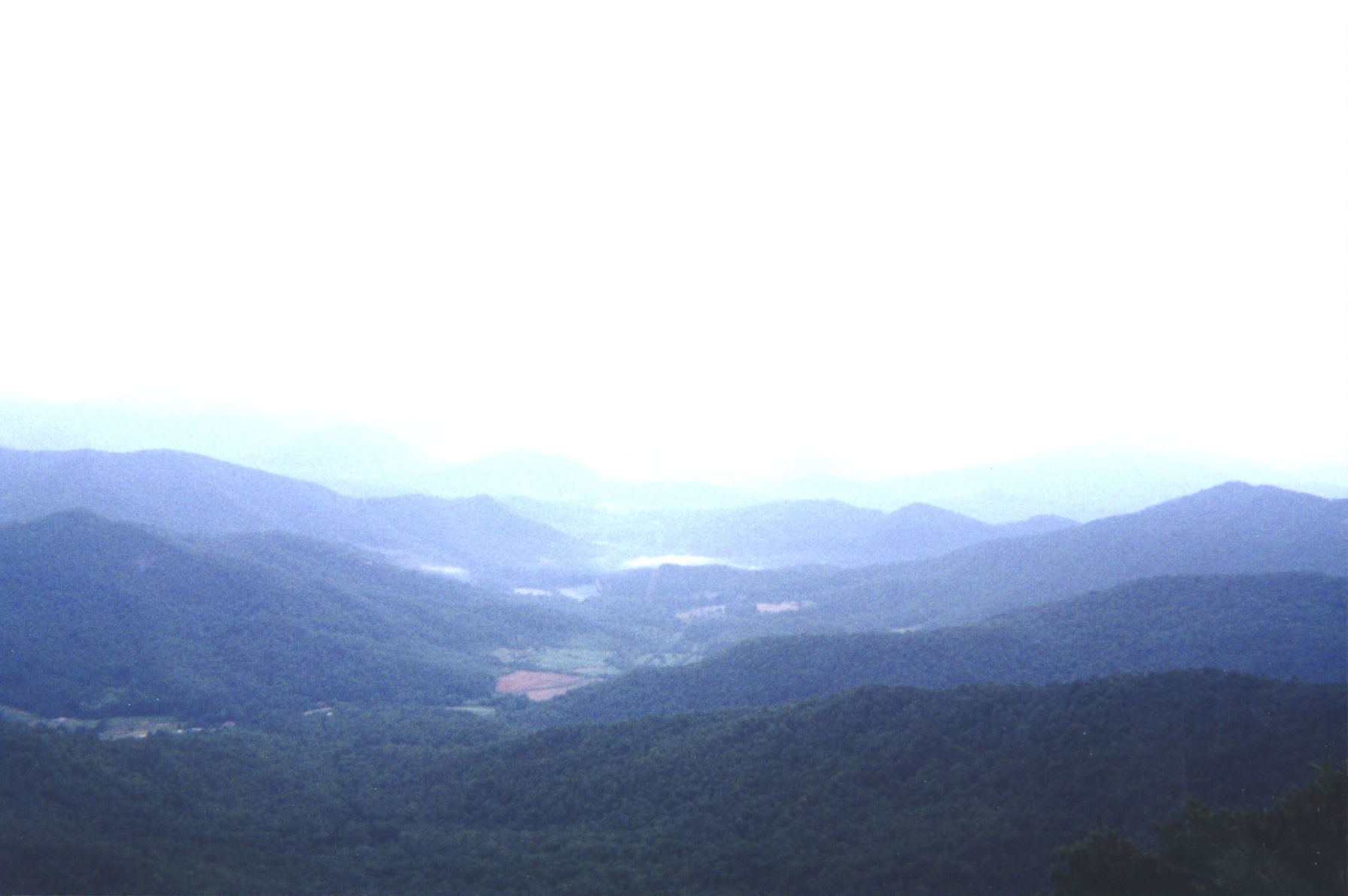 Whiterock Mountain also had a spur trail leading to the summit. We were smart this time; we dropped our packs to follow it to the top. The view was absolutely stunning with the whole Tessentee Valley laid out before us. We were on the southwest side of the mountain on the rocks that give the mountain its name. This was the best vista yet. Looking into the valley and up into the mountains fading off to the horizon was awe inspiring. I felt like one of the early explorers seeing this fertile land for the first time. Directly to the northwest, we could see Conley Ridge descending steep to the valley floor from the ridge line we were hiking. In an arc as far as was visible, from northwest through southeast, were many mountains climbing out of the valley -- Cedar Cliff, The Pinnacle, George Gray Mountain, Richey Knob, Buck Knob, Chestnut Mountain, and possibly Scaly Mountain in the far southeast. It was a stunning view that will be with me for the rest of my life.