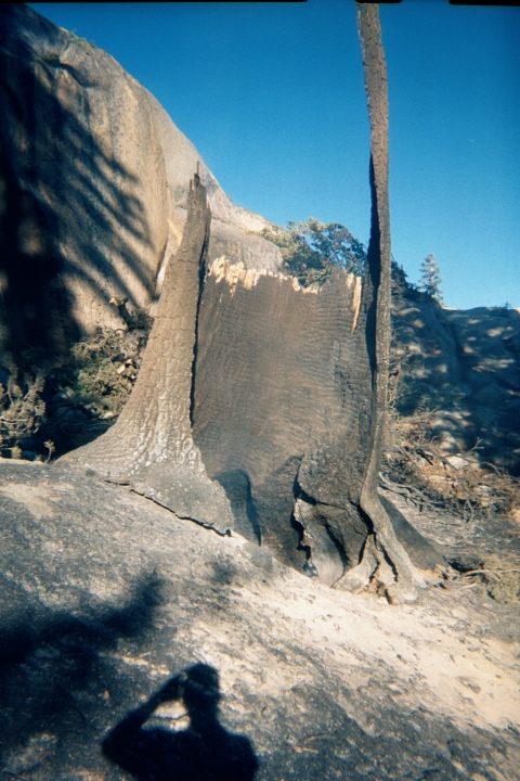 (Saturday, October 13, 2001) This is the stump of the tree which started the fire. The trunk is lying behind. You can see the cliff which boxed the fire in on one end. The burnt out stump was huge. I'd estimate it to be about 10 feet in diameter. You can see how it's all burnt out on the inside. There was still smoke coming from the ash in the center of the stump. The crown of the tree, in the corner of the rock face was actually still burning. I could see some decent sized flames from my vantage points. The Forest Service knew about the fire, and as per the new management plan, they were letting it burn. It didn't look like it would get out of control. It appeared to have pretty much burned itself out. Since there is so much rock, the fire didn't have many options to spread.