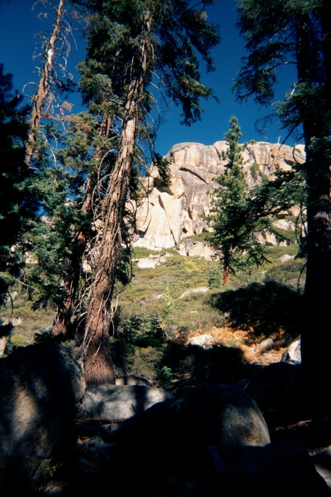 (Saturday, October 13, 2001) Along the trail shortly after the last view, this amazing set of rock formations followed the left side of the trail for a mile or so. This is just one of the rock faces which had me drooling for a rope and climbing partner. There is a ton of amazing face and crack climbing here. Next spring or summer, I want to come out for a week of camping and climbing. I'd like to setup a base camp and head out to the cliffs in this area.